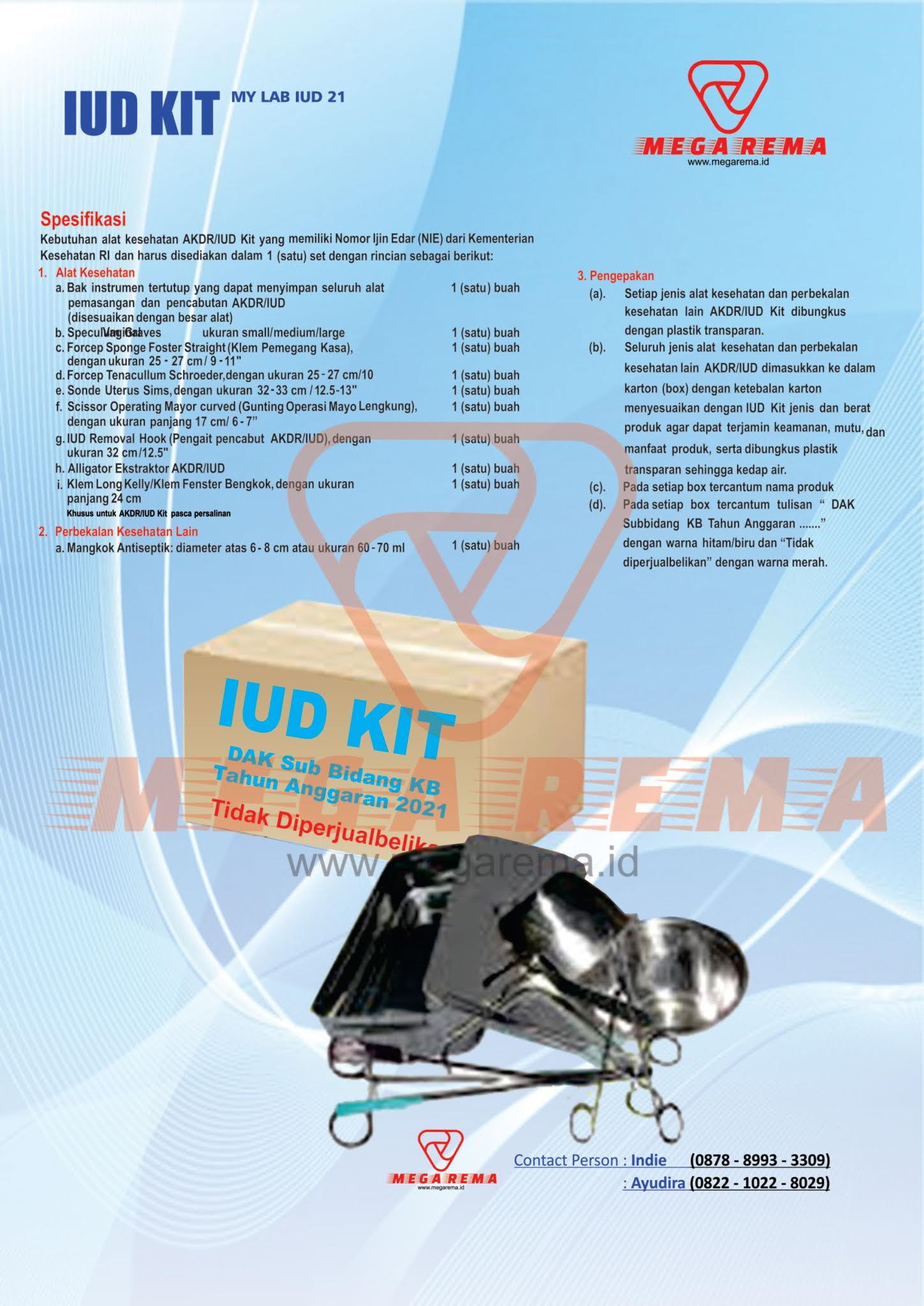 Kebutuhan alat kesehatan AKDR/IUD Kit yang memiliki Nomor Ijin Edar (NIE) dari Kementerian Kesehatan RI dan harus disediakan dalam 1 (satu) set dengan rincian sebagai berikut :